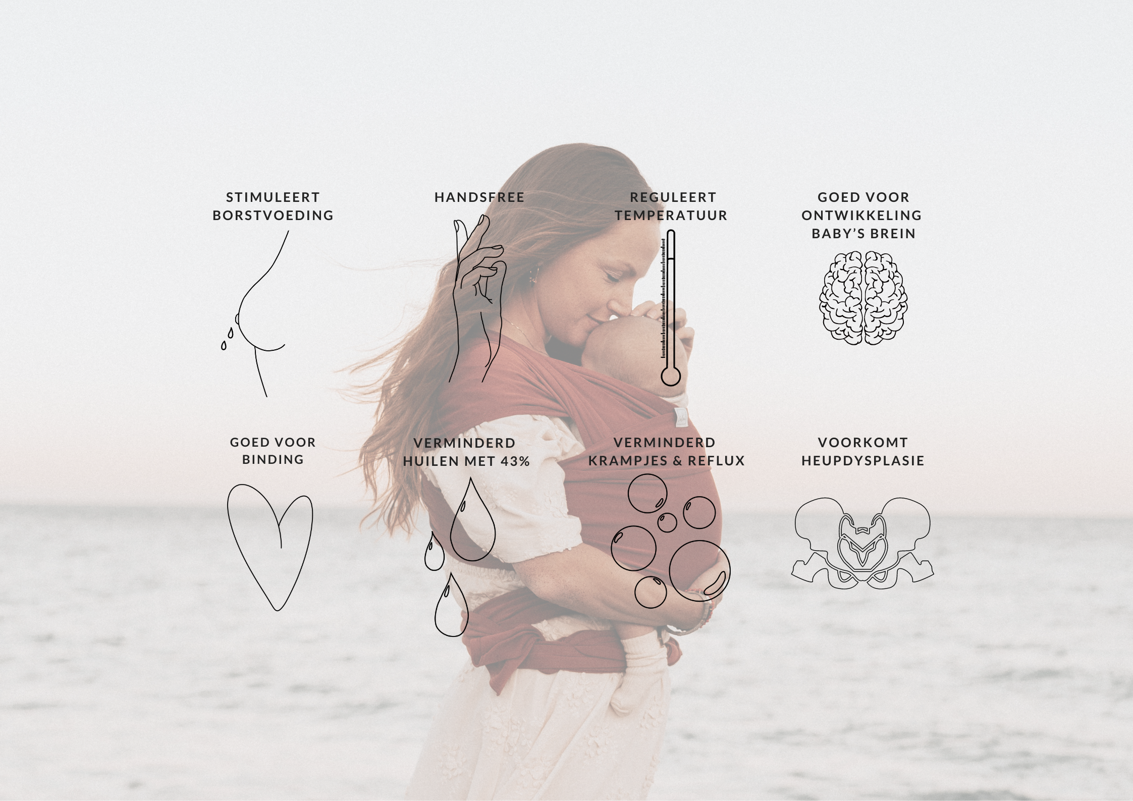 STIMULATES BRAIN DEVELOPMENT: A baby is born with only 25% of its brain capacity. The remaining 75% develops further in the first two years. Brain development continues into the twenties and is strongly influenced by the environment. By carrying your baby, you respond to his needs and promote the formation of brain connections, which is essential for healthy brain development.